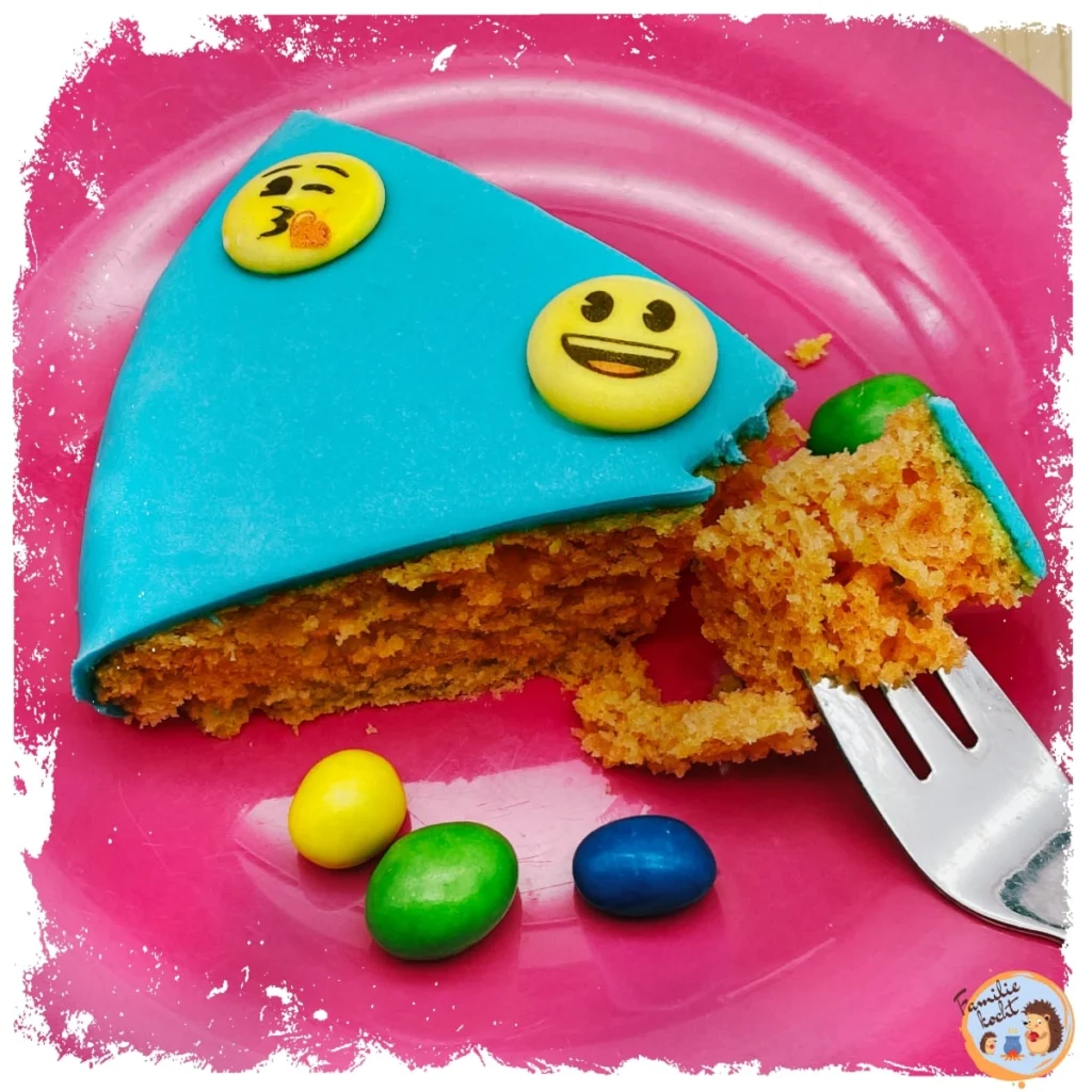 Achtung: Das Ausrollen ist etwas anstrengend und zeitaufwändig, wenn es richtig dünn werden soll. Aber das Ergebnis sieht wirklich profimäßig aus! Die Emojis habe ich mit Zuckerguss festgeklebt und mich sogar an einer kleinen Schleife probiert. Das große Kind war begeistert und fand, das war der coolste Geburtstagskuchen, den sie je hatte. Na also 😉