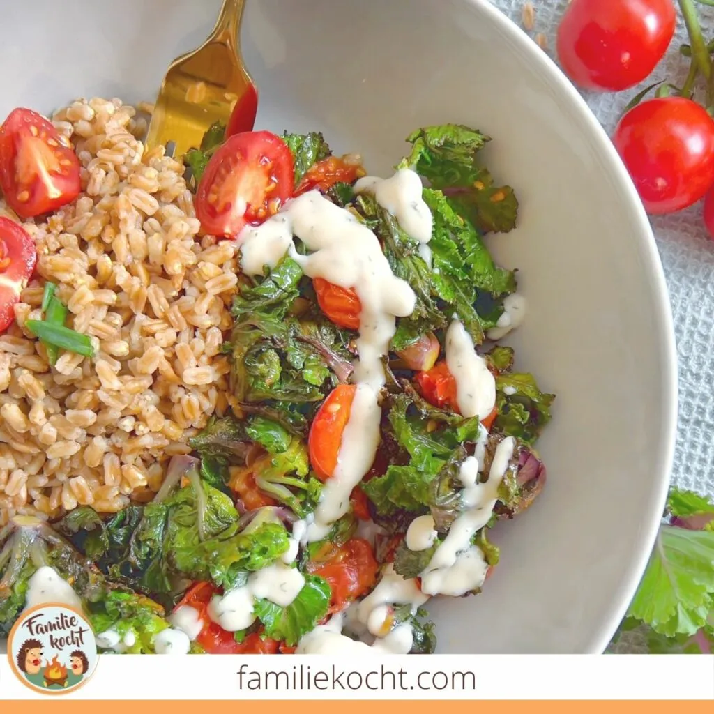 Dazu haben wir Vollkorndinkel und eine leckere Sauce aus Schalotte, Öl, Sojasahne und Senf kombiniert.