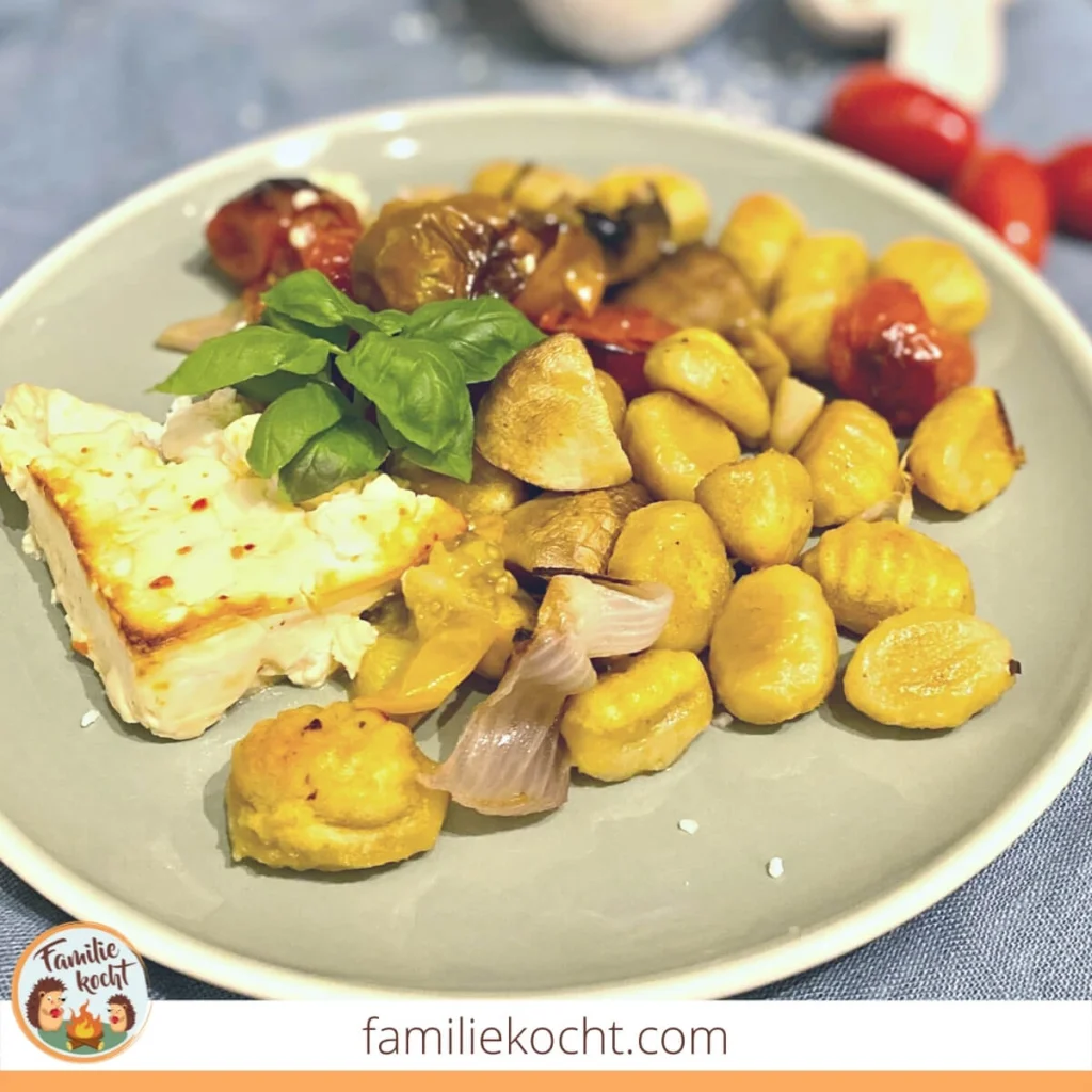 So habt ihr Gnocchi wahrscheinlich noch nie zubereitet: Mit frischem Gemüse im Backofen! Die Gnocchi vom Blech sind leicht knusprig und dank des weichen Fetas, den kleinen Tomaten und den Champignons eine herzhafte Überraschung!