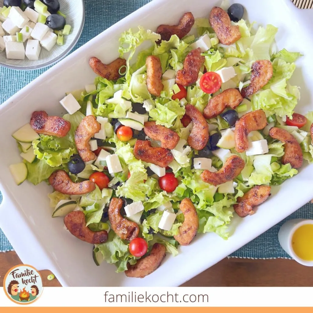 Und alle lieben das herzhafte Vegi-Hühnchen im Salat Rezept und frisches Brot dazu. Am Ende sind alle zufrieden und die Salatschüssel ist leer 😉