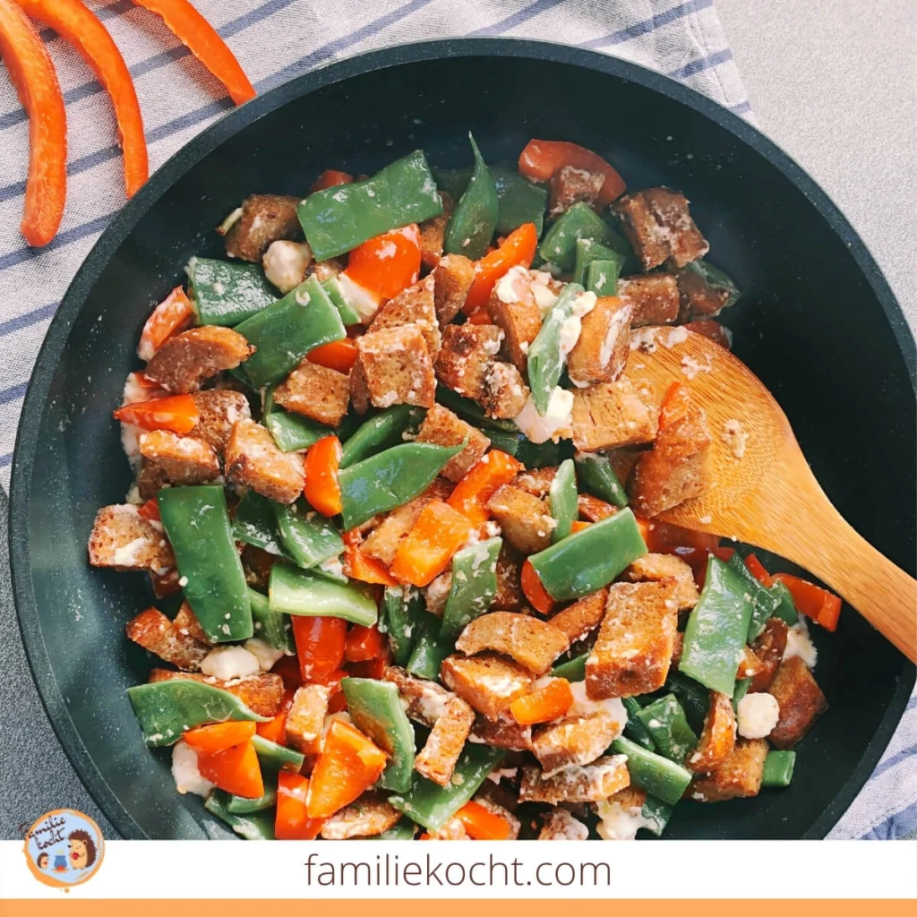 Anstatt der Paprika eignen sich auch Cherry-Tomaten, Zucchini oder Aubergine für die Pfanne, je nachdem, was euer Vorrat hergibt. Sogar Brokkoli oder Blumenkohl, in kleine Röschen geschnitten, sind herzhaft angebraten sehr lecker!