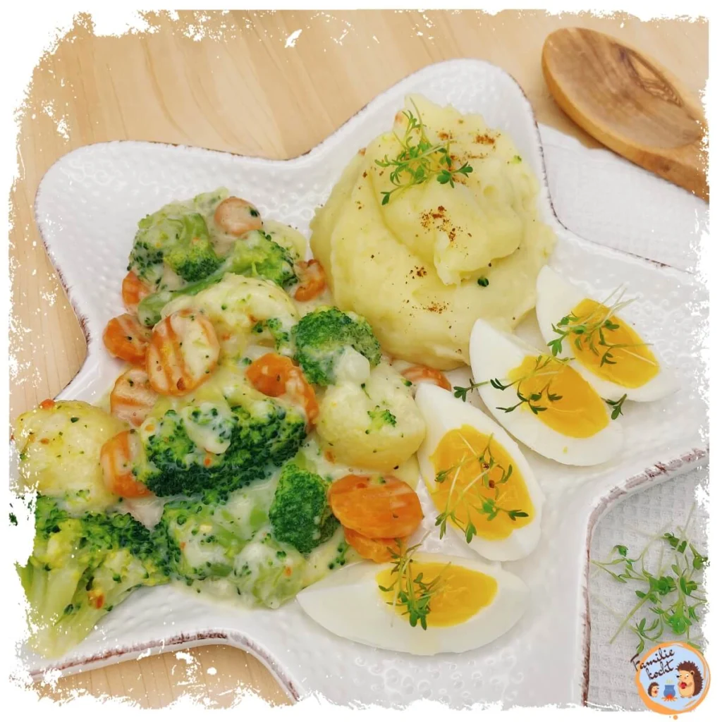 Eine bunte Mischung, die Kinder gerne auf dem Teller haben: Dieses Kaisergemüse Rezept mit Kartoffelbrei und Ei enthält Möhren, Broccoli und Blumenkohl zu etwa gleichen Teilen. Das Gemüse kann sowohl frisch als auch eine Bio-Tiefkühlmischung sein.