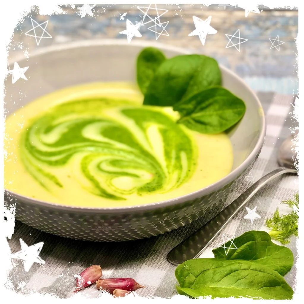 Die marmorierte Kartoffel Fenchel Suppe mit Babyspinat ist ein echter Hingucker auf dem Tisch und überraschend einfach gemacht! Ganz vegan, schnell & lecker ♥
