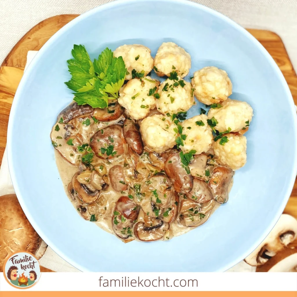 Am schnellsten geht das Gericht mit fertigen Mini Semmelknödeln. Lecker ist aber auch frischer Kloßteig „halb & halb“, aus dem man kleine Mini-Knödel zum Pilzrahm selbst formen kann, daher stehen beide Varianten im Rezept.