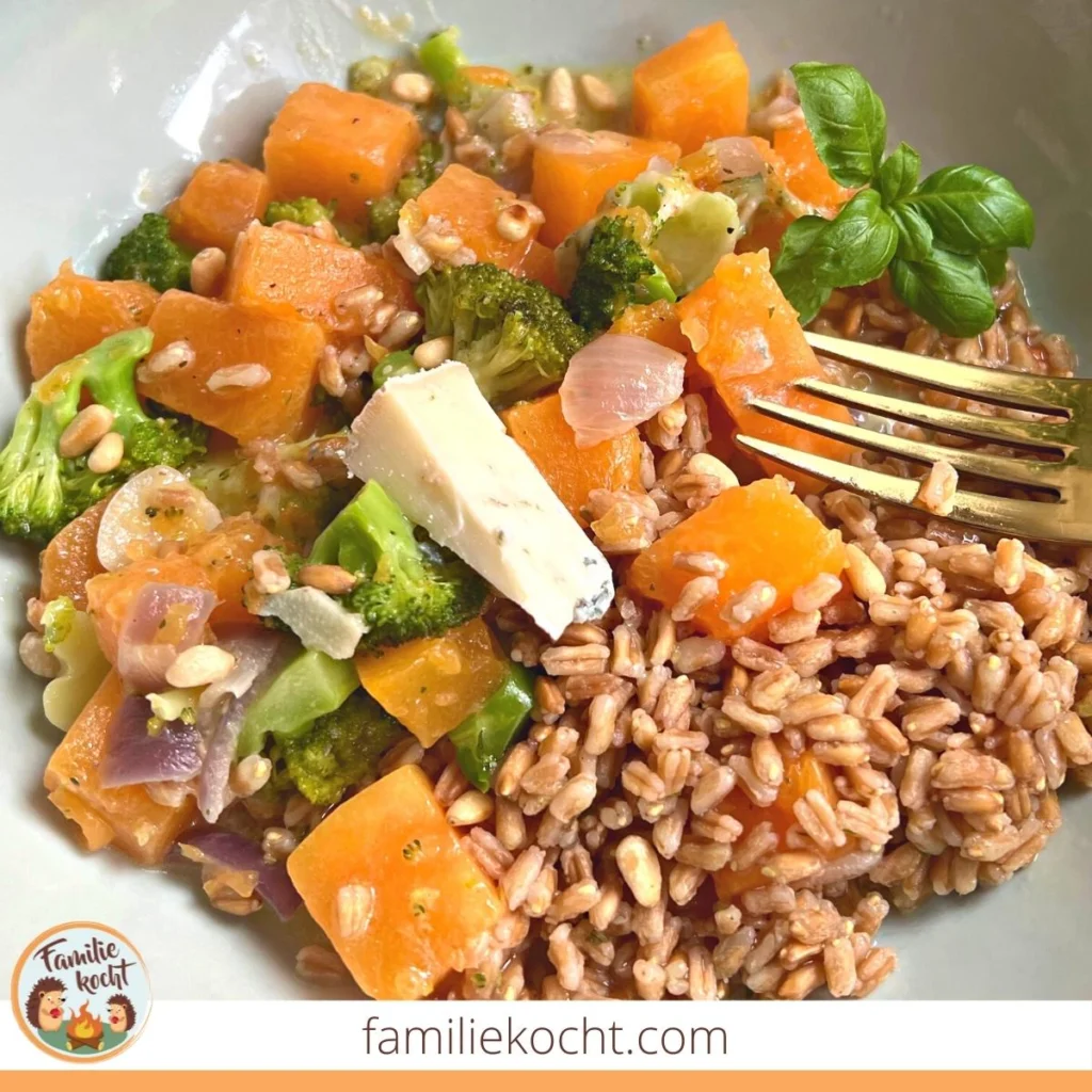 Damit habt ihr ein leckeres und gesundes Herbstgericht gezaubert, das satt macht. Dank Kürbis und Brokkoli versorgt ihr euch mit vielen Vitaminen.