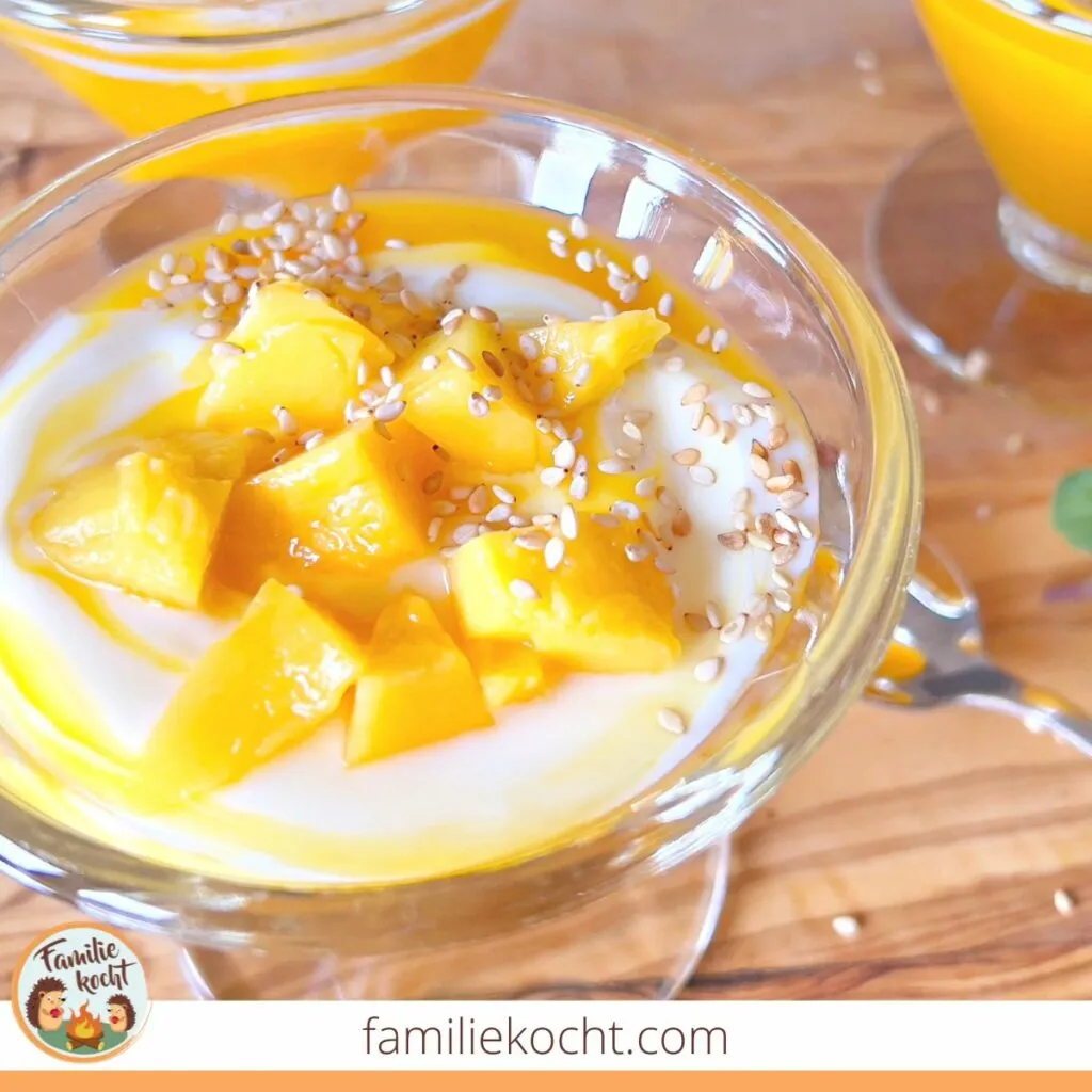 Zum Garnieren haben wir Sesamsaat geröstet. Aber auch geröstete Kokosflocken oder gehackte Pistazien passen perfekt. Möchtest du das Mangopüree selbst machen, dann püriere dir eine reife Mango mit etwas Zitronensaft und verwende eine zweite als Topping.