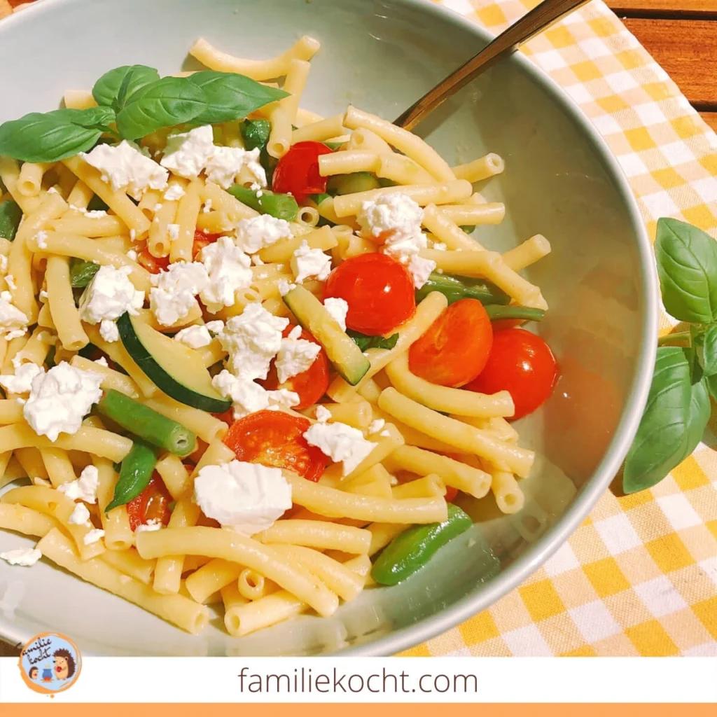 Wer mag, gibt schon ein paar Blättchen Basilikum mit zum Gemüse und schwenkt nach dem Kochen die Nudeln gleich mit in der hohen Pfanne.
