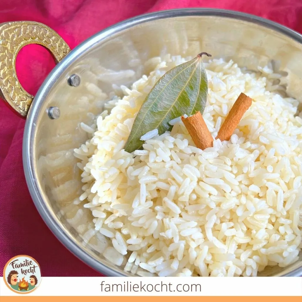 - Den Reis servieren mit opional einer Zimtstange und ein paar Kardamomkapseln dekorieren