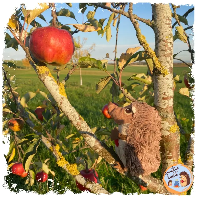 Auf unserer Wiese gibt es viele kleine Apfelbäume. Die finden meine Menschenkinder super und pflücken sich ein paar reife, rote Äpfel. Wie die in der Herbstsonne leuchten! Ich kann mich gar nicht satt sehen.
