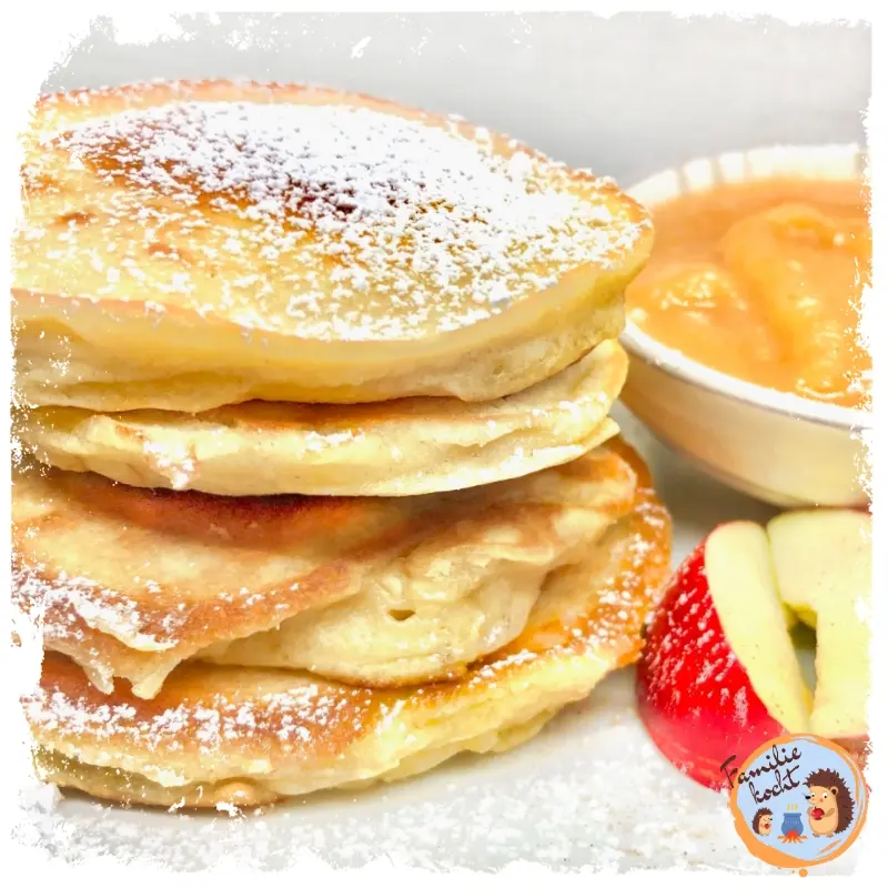 Das Geheimnis ist, dem Teig einige Minuten Ruhe zu gönnen und etwas Apfelmus hineinzurühren. Dann gibst du kleine Teigkleckse langsam und vorsichtig in die heiße Pfanne und bäckst sie von beiden Seite goldbraun.