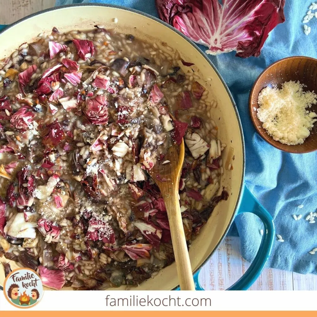 Es gibt Rezepte, die einem Kind wahrscheinlich nie schmecken werden. Es gibt aber auch Zeiten, in denen man auch mal nur für Erwachsene kocht – und dann ist ein deftiges Radicchio Risotto mit Parmesan auf jeden Fall einen Versuch wert.