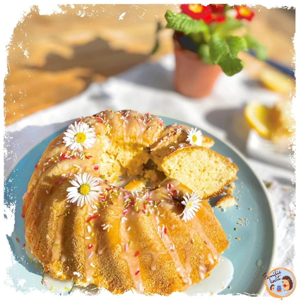 - Nach dem Abkühlen kannst du den Joghurtkuchen mit Zitronenglasur und vielen Streuseln und frischen Gänseblümchen aus dem Garten verzieren oder ihn pur mit Puderzucker bestäubt genießen.