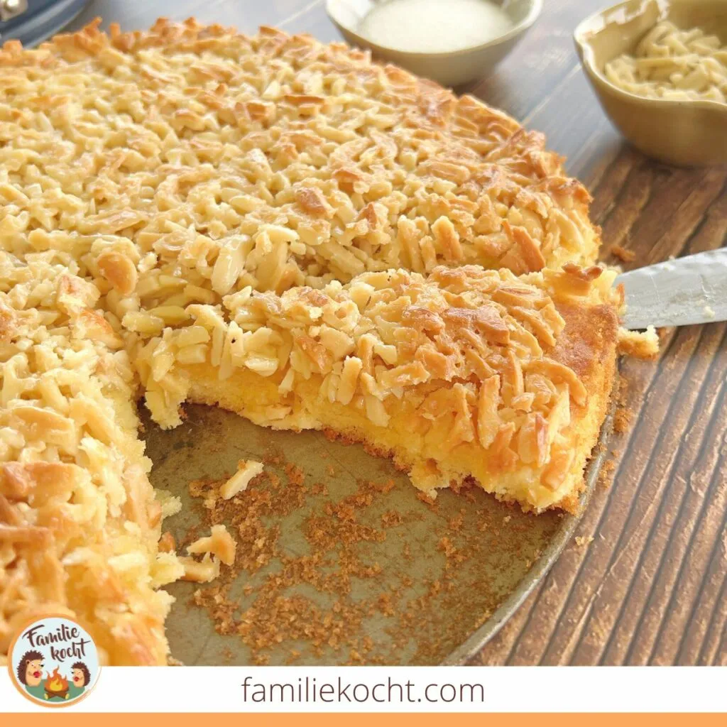 - Die Springform aus dem Ofen nehmen und die Mandelmischung auf dem Teig verteilen. Die Form erneut in den Ofen stellen und für etwa 15-20 Minuten weiterbacken, bis die Mandeln mit dem Zucker karamellisiert sind.