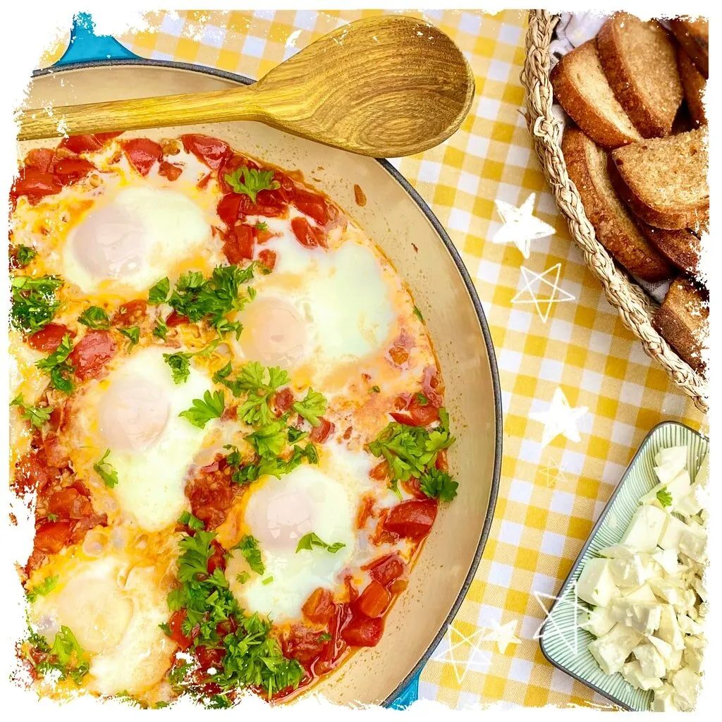 Sie ist das Nationalgericht in Israel und wird dort gerne zum Frühstück gegessen. Sie ist perfekt, wenn ihr gerade viele reife Tomaten in eurem Garten ernten könnt. Verfeinert mit Petersilie oder Koriander und etwas Feta darin schmeckt sie uns am Besten. Dazu passt frisches Weißbrot.