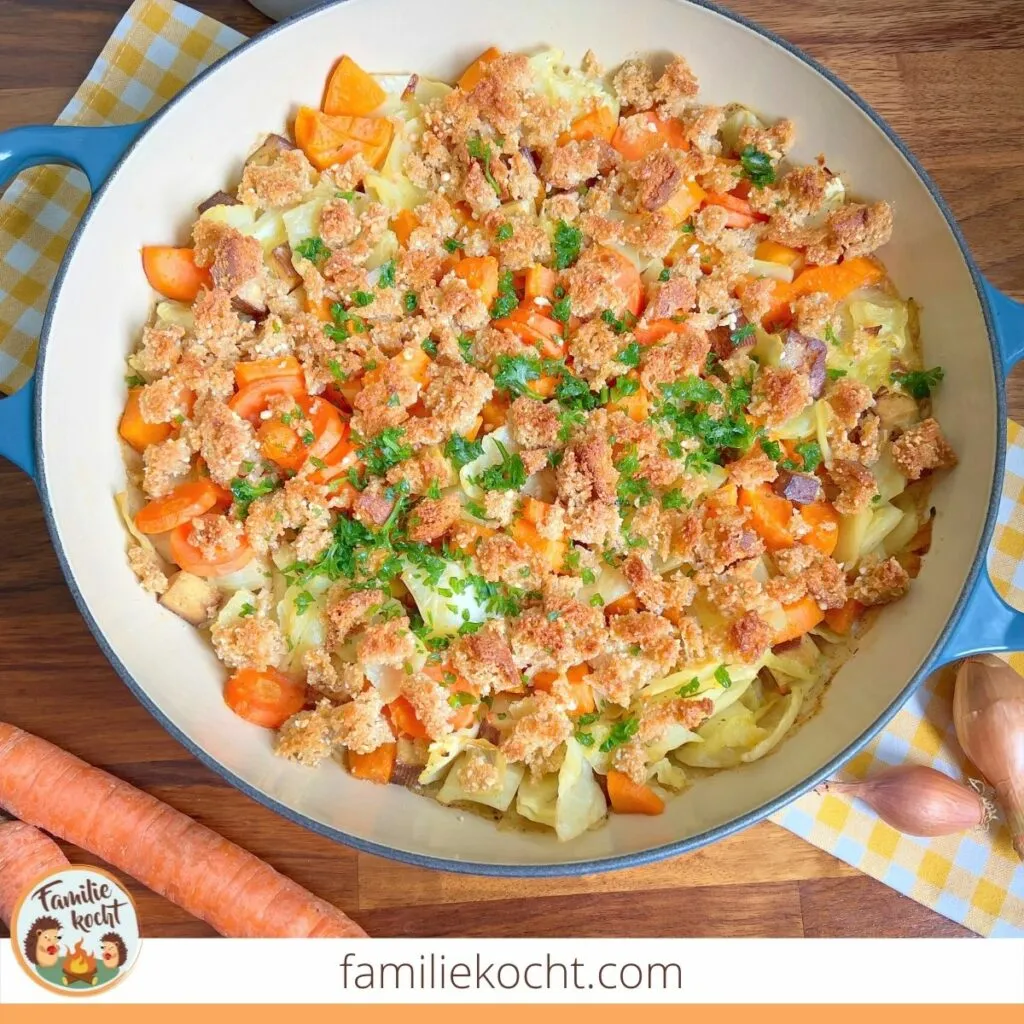 - Den Inhalt der großen Pfanne in die Auflaufform geben. Süßkartoffeln und Karotten abgießen und ebenfalls mit in die Form geben und vermischen. Die Brotkrümel darüber verteilen und für 25 Minuten knusprig braun backen.