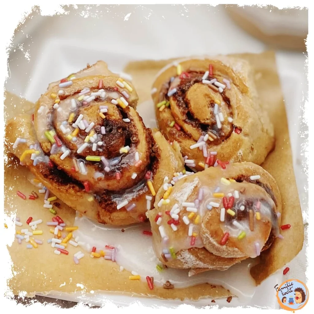 Da mir neulich beim veganen Backen das Bindemittel gefehlt hatte und alles auseinandergefallen ist, habe ich es diesmal besser gemacht und zwei gute Esslöffel Apfelmus in den Teig gegeben. Für den Zuckerguss, der am Ende über die fertigen Schnecken gegossen wird und sie noch saftiger macht, haben die Kinder einfach Puderzucker mit etwas Pflanzenmilch verrührt – und sie ist das Tüpfelchen auf dem Zimtschnecken-i geworden!