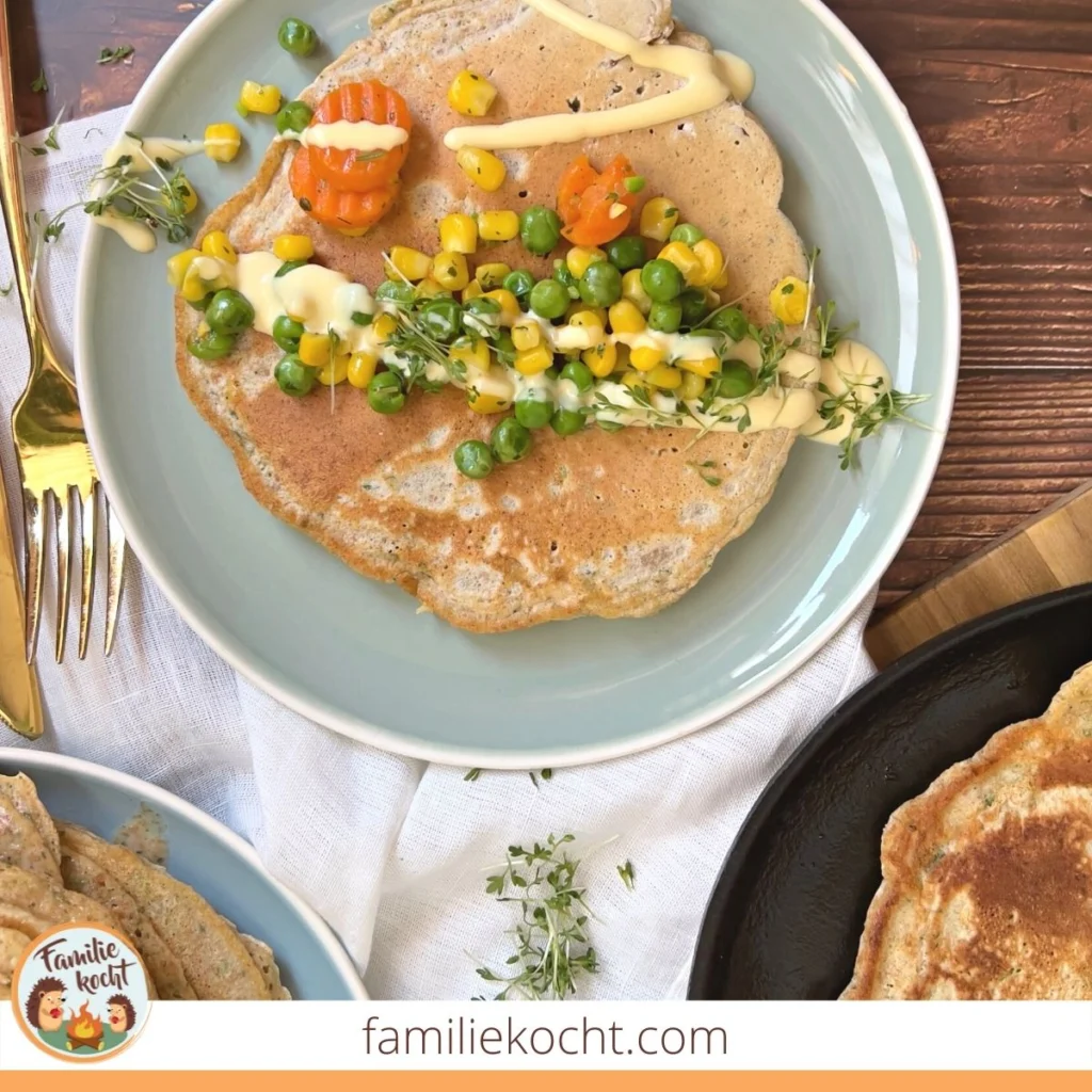 - Lasse den Teig einige Minuten ruhen und backe dann der Reihe nach schöne goldbraune Pfannkuchen aus. Die Pfannkuchen kannst Du nach Belieben mit Gemüse oder Käse und cremiger Sauce servieren.